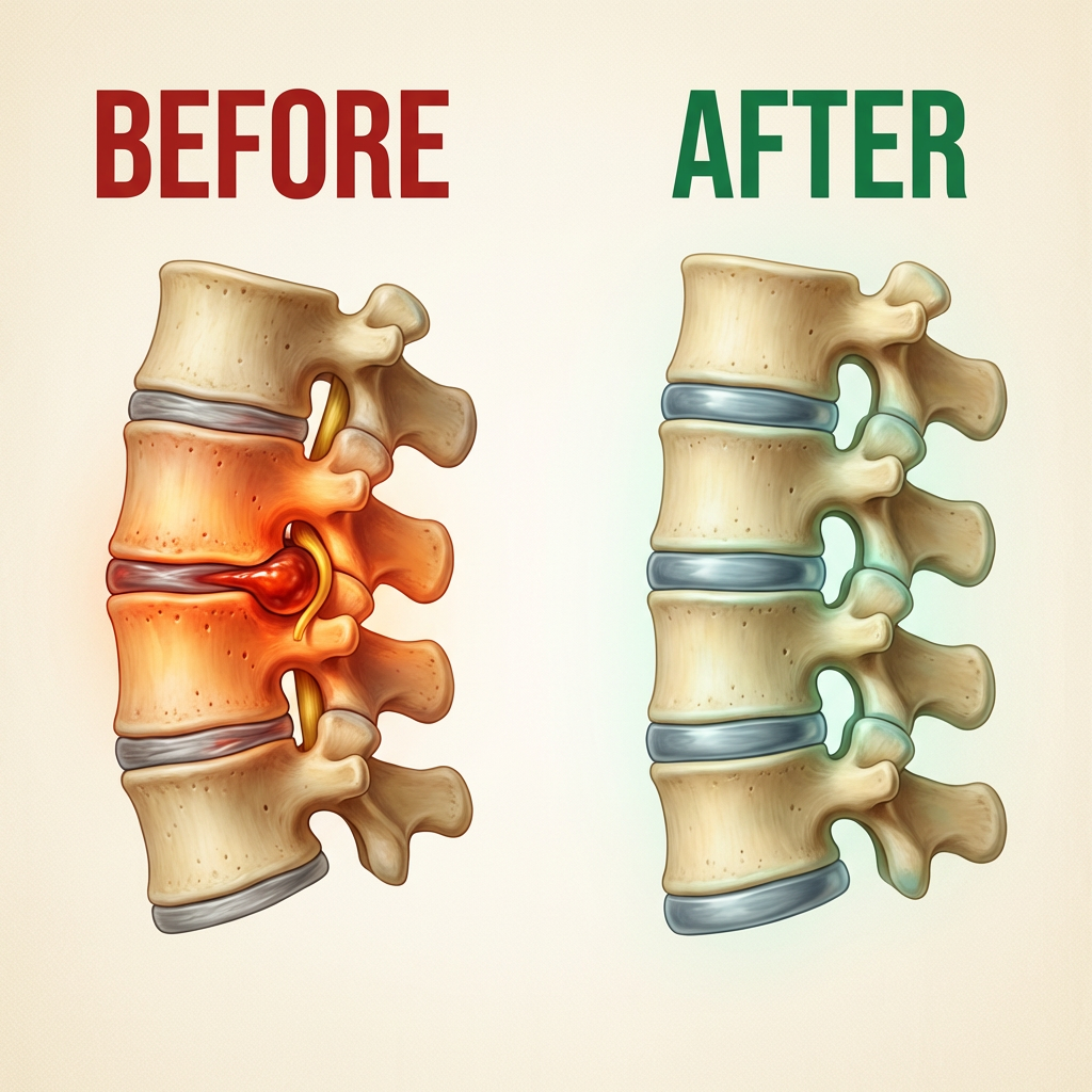 Surgery — removes the pressure mechanically. Doesn't rehydrate the disc. Doesn't retrain the muscles. 40% of patients report no lasting improvement.